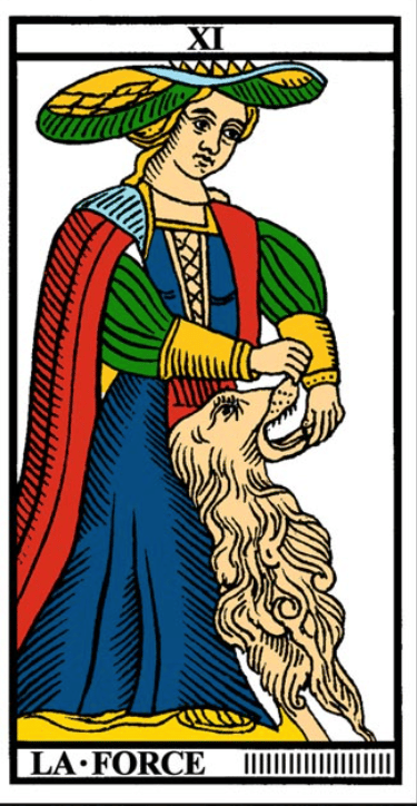 Dans le Tarot, au centre de l’arcane de la force, trône un lion, la gueule tenue ouverte par une femme, sans effort. Ce lion représente ici l’énergie vitale semblant être maîtrisée. D’ailleurs cet arcane est celui des arts martiaux. Il faut une certaine maîtrise pour pouvoir tenir dans sa verticalité. La clef serait-elle d’affronter ses peurs (représentées par le lapin caché dans la crinière du lion.)? Trouver son centre pour pouvoir tenir droit : indépendant et autonome. Le 11 est un chiffre particulier, on dit que c’est un maître nombre, symbolisant entre autre puissance et intuition.